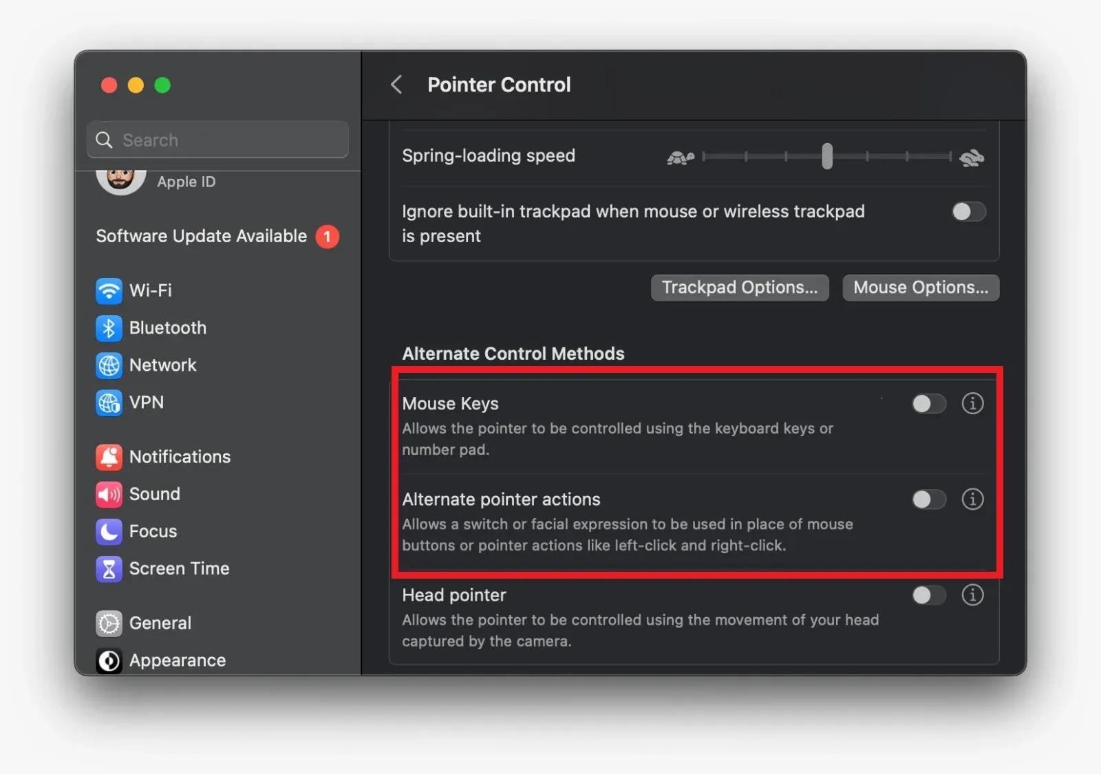 Open Accessibility Settings: Go to System Preferences > Accessibility > Pointer Control > Alternate Pointer Methods.